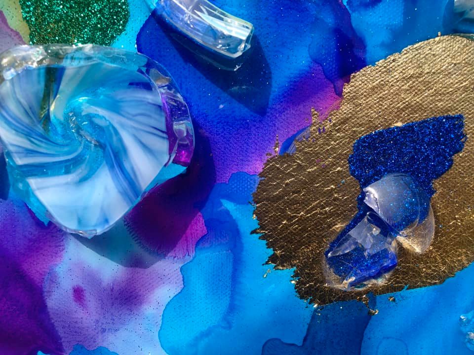 Bula first sketches her composition and then paints. It often takes hundreds of layers of color to bring her vision to life. Once the painting is complete, Bula adds luxury materials to the canvas, including artist blown glass, 24-karat gold, precious gems, crystals and more. Bula creates her masterpieces on canvas, reclaimed wood, and metal.