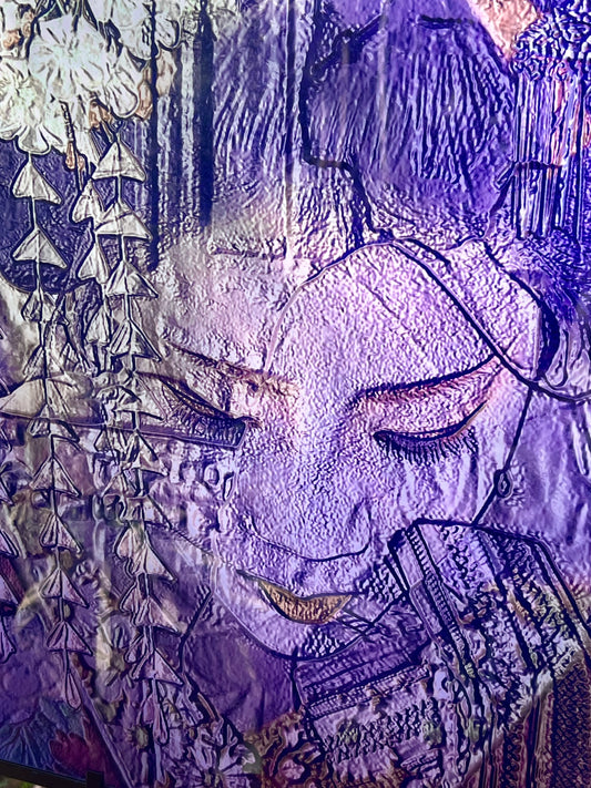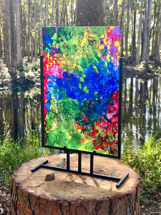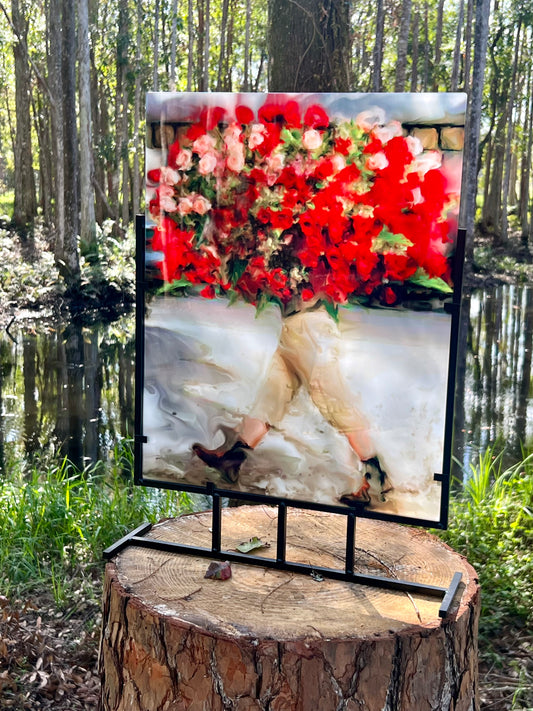 Bula's limited editions on glass are created by printing her original artworks onto tempered glass. The glass is translucent, so light shines through it. This accentuates the artist's brushstrokes, creating an almost 3-D effect. Each piece comes with a custom iron stand, certificate of authenticity and is numbered and signed.